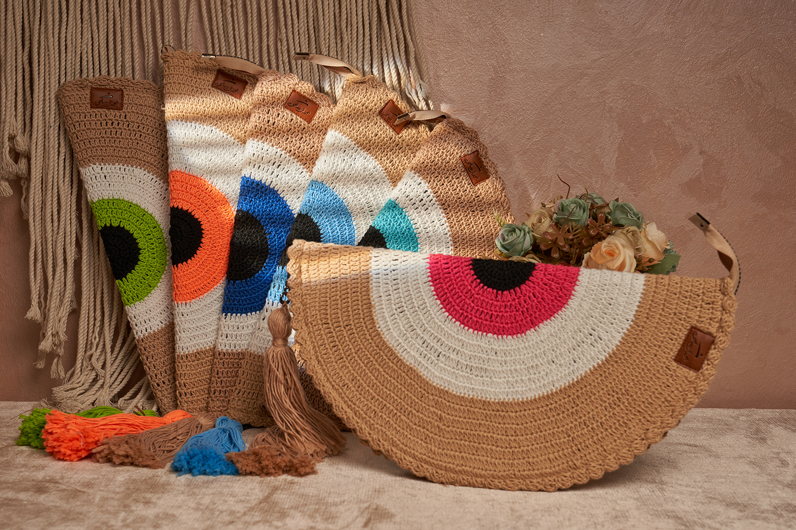 These eye-catching crocheted clutches feature a striking evil eye design in a vibrant array of colors, each finished with a playful, matching tassel. Perfect for adding a pop of color and symbolic protection to your resort wear or casual summer outfits.