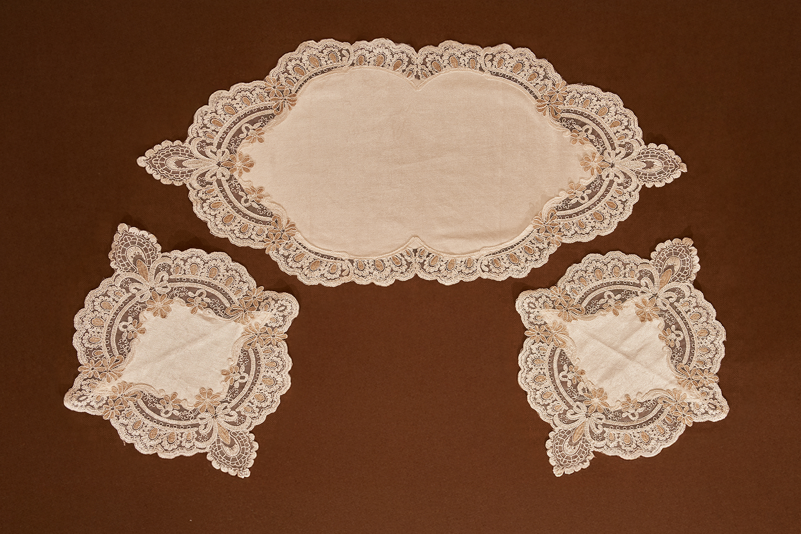 This exquisite salon table set features a runner and two matching placemats, each showcasing delicate cream and gold lace embroidery with an intricate floral and scrollwork design.