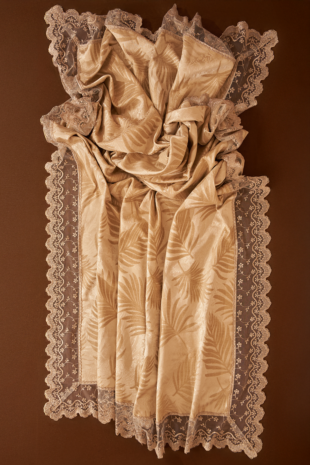 This exquisite dining table runner features a rich, golden fabric with an embossed palm leaf pattern. It's elegantly trimmed with a delicate floral lace border, adding a luxurious and sophisticated touch to your table setting.