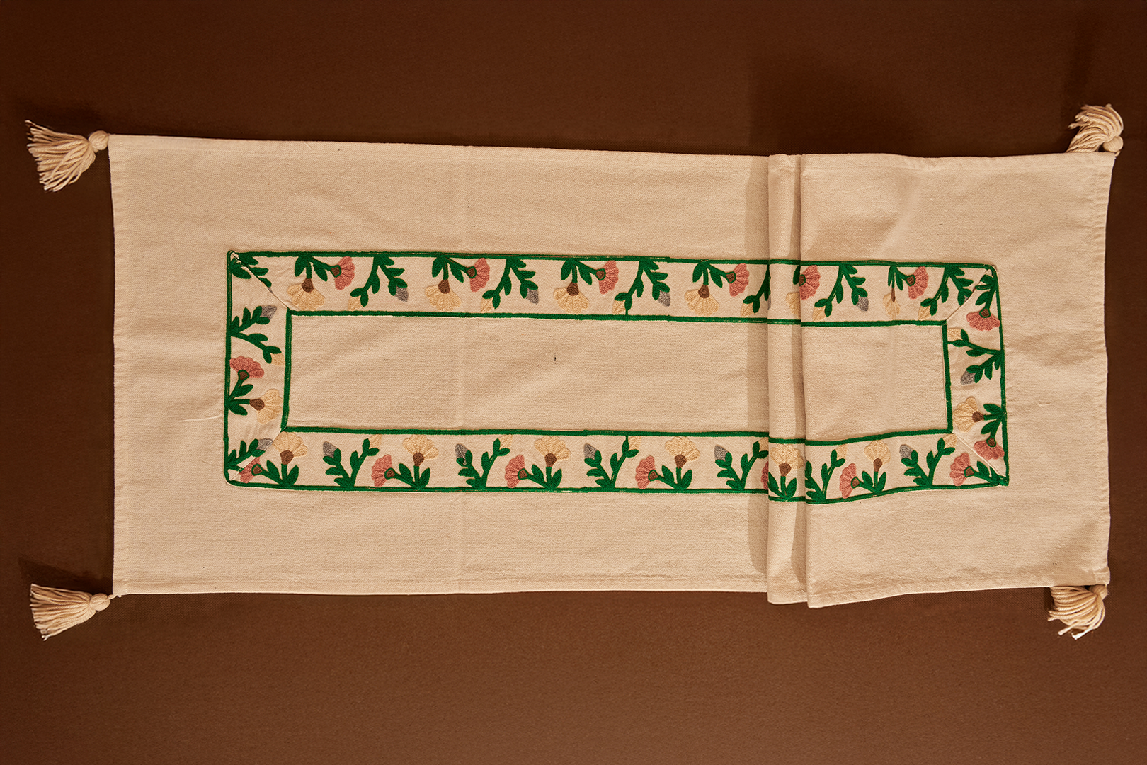 A beautifully hand-embroidered 200 x 40 cm table runner, crafted from natural cotton. It features intricate floral patterns and soft tassels, adding a touch of elegance and handcrafted charm to any table setting.